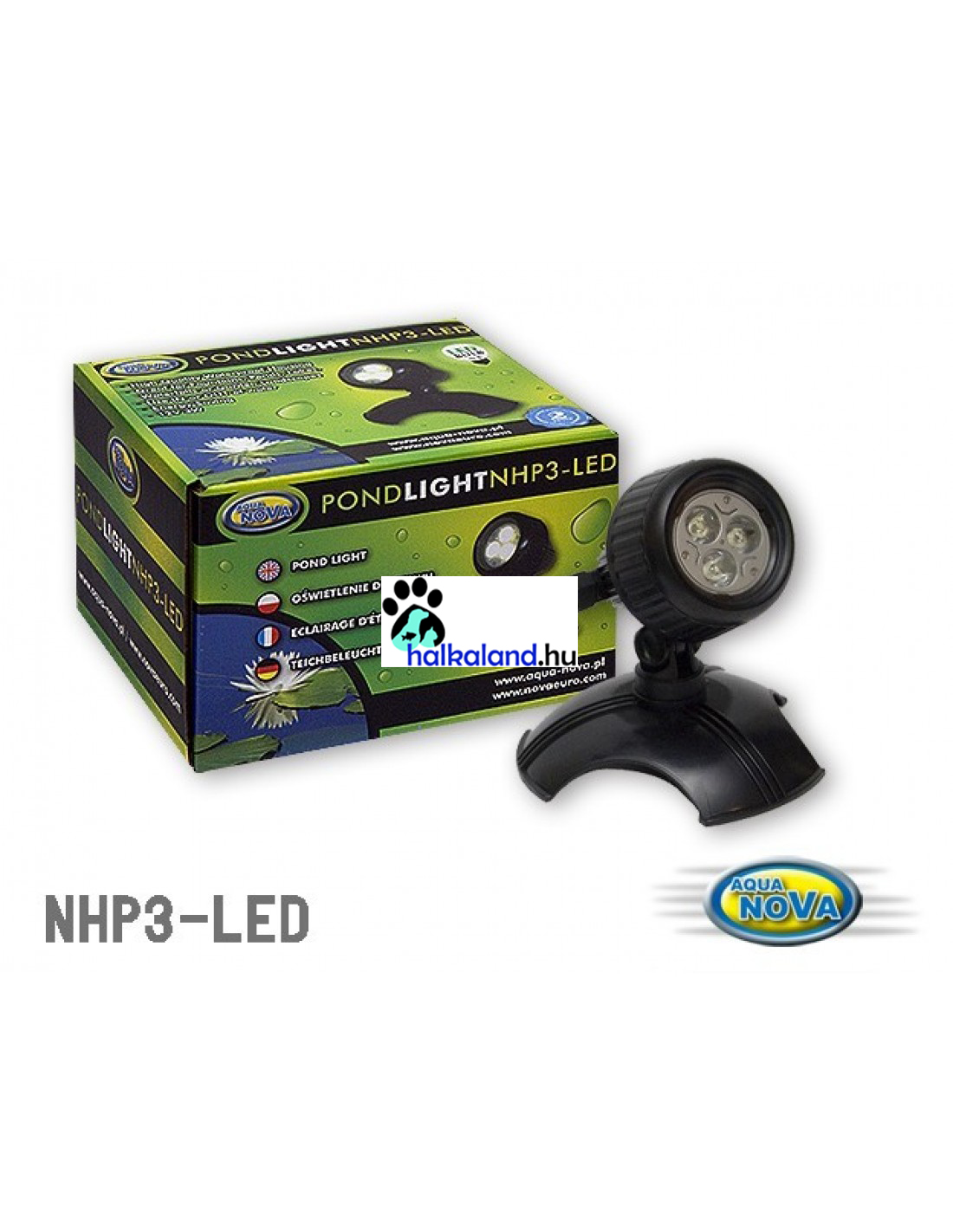 Aqua Nova NHP3-LED kerti tó LED világítás. Energiatakarékos megoldás a kerti tó vagy kert látványos megvilágításához. Vízalatti és vízen kívüli használatra is alkalmas, LED izzós kerti lámpa. Ideális kerti tavak, csobogók, kerti dekorációk megvilágításához. Hosszú, kültéri használatra alkalmas elektromos vezetékkel, IP44 szabványú elektromos csatlakozással.