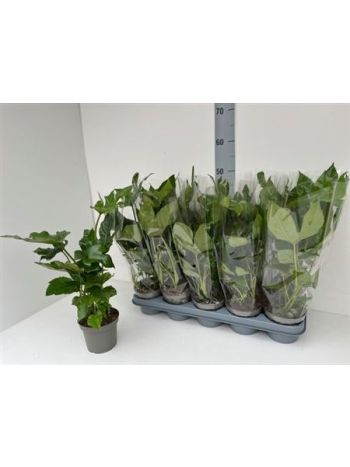 A Fatsia japonica, közismert nevén japán arália, egy látványos, nagy levelű dísznövény, amely egzotikus megjelenésével azonnal magára vonja a figyelmet. A fényes, mélyzöld, ujjasan szeldelt levelek karakteres, dzsungelszerű hangulatot árasztanak. Alkalmas beltéri és kültéri (félárnyékos) tartásra is, így kiváló választás trópusi stílusú enteriőrök, teraszok vagy árnyékosabb kertrészek díszítésére.