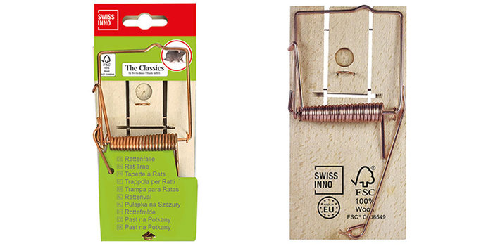 Klasszikus fa patkánycsapda. Nagyon erős rugóval készült, óvatosan kezelje. A csapdához kesztyúvel nyúljon hozzá, hogy a lehető legkevesebb emberi szag maradjon rajta. A csapdát rögzítse a talajhoz, mert a megfogott patkány elvonszolhatja, ha nem túl súlyosan sérült.
