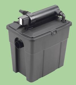 7 wattos víz alatti UV-előtisztító készülékkel a lebegő algák ellen. Többkamrás szűrőedény, különböző szűrőanyagokkal (szűrőszivacs, biofelületű szűrőelemek)